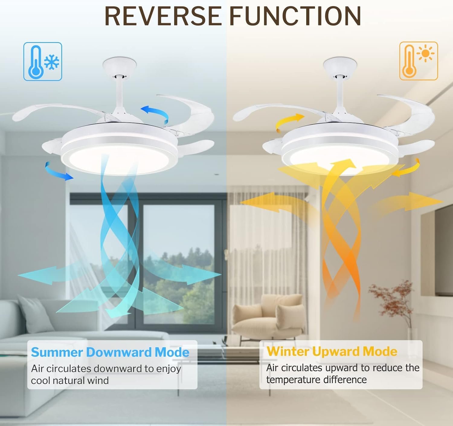 Invierte el giro de las aspas con solo pulsar un botón. En modo inverso, el ventilador empuja el aire caliente acumulado en el techo hacia abajo, mejorando la eficiencia de la calefacción y ahorrando hasta un 15% en facturas de invierno.